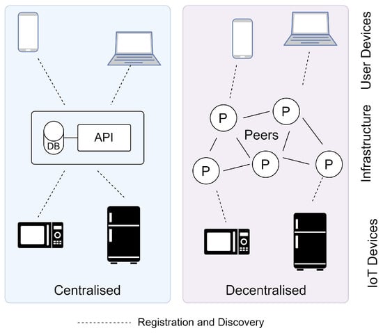 Figure 1 illustrates the communication between user and IoT devices with centralised and decentralised registries, highlighting the network of peers (P) supporting the latter case. Note that for decentralised approaches, both the user and IoT devices must typically either operate as peers or utilise existing peers to interact with the registry.
