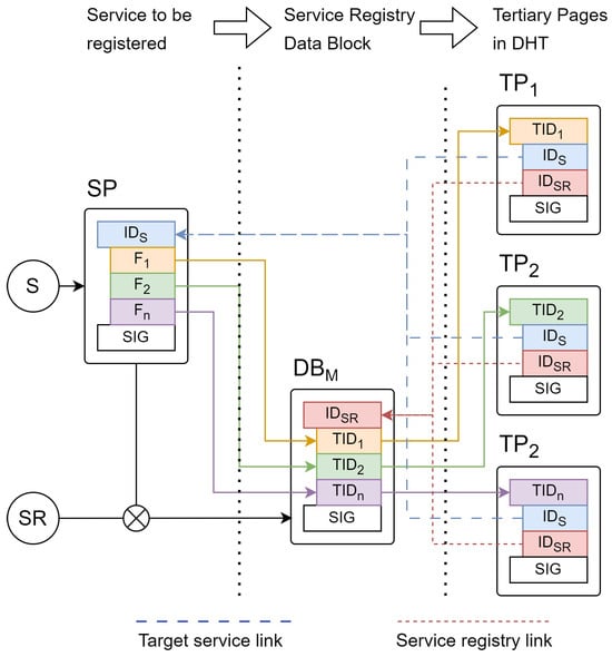 To register a service, the DSR is provided with a Service Page (SP) describing the service to be registered, including endpoint types and associated metadata. For example, an office environmental sensor may have endpoints for temperature, pressure, and humidity, as well as a friendly name for the device and a room location. The DSR then derives a TID for each of these fields and publishes a Data Block (DB) containing the target service ID and generated TIDs, creating a verifiable signature-chain of records provided by the registry. This signature chain provides an immutable history of registry operations similar to the Certificate Transparency (CT) logs issued by TLS Certificate Authorities (CAs), allowing for the operation of the registry to be validated as well as enabling queries using the historical registry state. Finally, the DSR generates a Tertiary Page (TP) for each TID containing the SIDs of the linked service and publishing DSR as well as a link to the associated DB, and it stores these in the database at the appropriate TID. Each TP contains an issuance and expiry date allowing for these to be validated and automatically removed from the DHT on expiry, and must be periodically re-published by the DSR to maintain the registry. To refresh or update registry entries, a DSR will publish a new DB and store the new TPs in the database, automatically replacing previous service information.