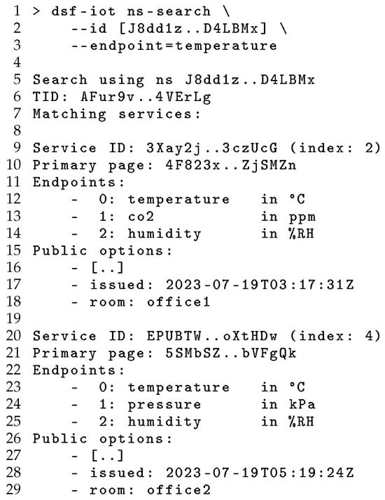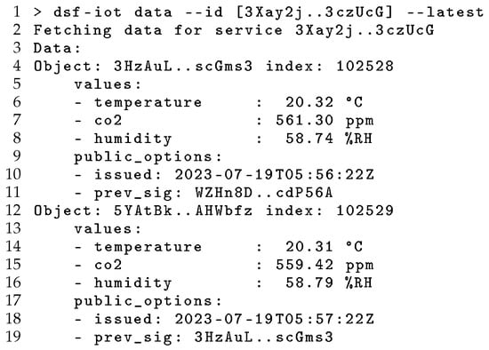 Figure 7 illustrates this operation using the CLI to request data from one of the services discovered in the previous example, which is decoded and displayed to the user. This provides an end-to-end approach to global service discovery and interaction, addressing the need for discovery mechanisms that integrate context-based querying with unambiguous specifications to describe services and data, and then using a DSF-IoT replication layer to access current and historic data published by discovered services. Published data objects are signed by the publishing service to provide integrity protection and linked into a signature chain to provide non-repudiation. In contrast with existing centralised and decentralised approaches, DSR provides trust and privacy, cryptographically associating registry entries with services and their data to allow users to verify the operation of registries and the results of their queries.