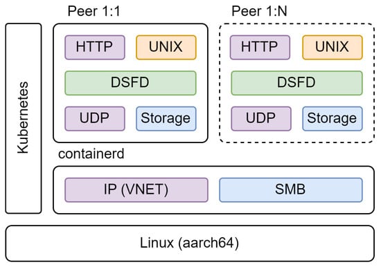 The testbench consists of a cluster of Raspberry Pi hosts communicating via an IP-based network. Raspberry Pis were selected as a reasonably available and standard host platform for clustering to provide an affordable, if less performant, alternative to ×64 computers, with the cluster consisting of 4× Raspberry Pi 4 and 4× Raspberry Pi 3 devices running 64-bit Debian Linux (6.1.21). Kubernetes was used for cluster orchestration to manage the deployment of application containers across available hosts as well as the resources available to each container. Containerd was utilised for isolation and virtualisation, providing a virtual IP network for communication between containers to emulate peer-to-peer connectivity via the internet as well as network-based storage to allow each peer to write and retrieve persistent information. Each peer executes a containerised version of the full DSF daemon which communicates with other peers using UDP packets and exposes an HTTP control API for use by the test harness. The Kubernetes API provides a programmatic mechanism to deploy and manage networks of peers deployed using the cluster. An overview of this software architecture is provided in