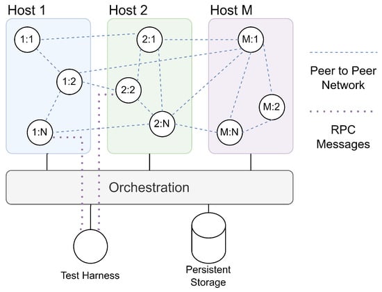 45], this approach provides a high-fidelity model of the distributed system to enable both performance and operational evaluation, including application, communication, and operating-system concerns at the cost of some scalability due to the increased cost of executing the full peer environment. The test environment consists of a network of peers deployed onto the cluster using the orchestrator, each interacting to support the operation of the distributed network. A test harness then interacts with simulated peers using the HTTP control API to configure and evaluate the operation of the distributed system. This network is illustrated in