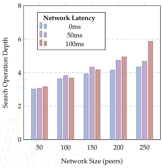 Figure 11 illustrates the average query depth required to resolve a query for each network size and latency. As the number of peers grows, the number of iterations required to locate peers near an ID increases, causing an increase in both the mean and variation of search durations, while increased network latencies cause an increase in both the duration and variation of search operations. This shows that across the tested network sizes, average query durations vary from 0.2 to 0.5 s with no injected network latency, 0.7 to 1.2 s with 50 ms of network latency, or 1.5 to 2.5 s with the worst-case 100 ms of network latency. It is expected that real-world performance will fall within these best- and worst-case bounds depending on network size and topologies.
