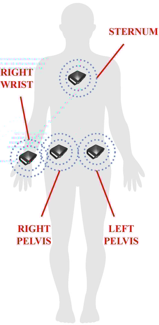 Hence, four sensors have been chosen and placed on the two sides of the human pelvis, the right wrist (i.e., the wrist of the dominant arm), and the sternum (see Figure 2), since they are anatomically close to the human joints that are driven during the execution of the selected ADLs. More in detail, the bilateral placement on the pelvis enables accurate monitoring of the pelvis movements; the sensor on the right wrist is essential for recording the arm swing that assists walking, as well as the use of hands to support lying-down action; the sensor placed on the sternum is useful to monitor the trunk, which mainly contributes in sit-to-stand and lying-down activities.