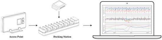 The experimental data are collected with the Motion Studio system by APDM (APDM Inc, Portland, OR, USA, https://apdm.com (accessed on 15 January 2024)). The system (see Figure 3) consists of the following three main components: