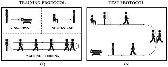 The two experimental protocols encompassed in the study with the aim of continuous HAR: (a) the protocol for acquiring the training dataset encompasses an interrupted execution of motor tasks, which are Lying-down, Sit-to-stand, and Walking+Turning; (b) the protocol for collecting the test dataset requires subject to perform the same tasks without interruptions on a predefined path.