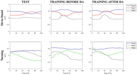 Hence, for each subject of the training dataset, signals have been treated with a conventional data augmentation technique by flipping to reproduce the operational condition of the test dataset and improve the classifier robustness [61]. More specifically, Figure 5 visually reports the normalized magnetometer signal of the IMU sensor located at the left hip during the execution of sit-to-stand and turning tasks related to the test dataset (i.e., continuous execution), and to the training dataset (i.e., separated execution) before and after data augmentation. The operational discrepancy leads the magnetometer signal to be flipped along the x-axis and z-axis for the turning action and along the x-axis and y-axis for the sit-to-stand task. Hence, such components of the training dataset have been flipped to make the magnetometer components of the training dataset resemble those of the test dataset.