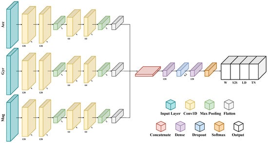 A grid-search method is employed to optimize the architectural characteristic of the 1D-CNN, i.e., determine the number of convolutional and dense layers, as well as the number of neurons that maximize validation accuracy [9,38]. Therefore, each branch consists of two 1D convolutional layers using 128 filters and kernels of size 5 for the first and 3 for the second one, and one max-pooling layer. Next, two 1D convolutional layers use 64 filters and kernels of size 5 and 3, respectively, followed by a max-pooling layer. Then, a flattened layer reshapes data into a linear vector. All convolution layers are characterized by a ReLu nonlinear activation functions. Subsequently, all three branch outputs are concatenated in one linear vector, thus gathering the smaller previous outputs. This composite feature vector is then fed through two fully connected layers, each with 128 neurons, for learning more abstract representations of the data. The first one is followed by a dropout layer that switches off 20% of the neurons to prevent overfitting. Finally, an output layer with a softmax activation function is included to classify tasks into one of the four defined classes. This layer is responsible for the final prediction of activity labels, based on the representations learned from the input data.