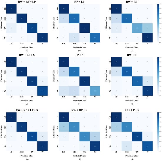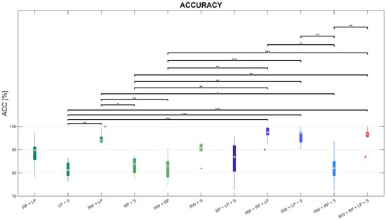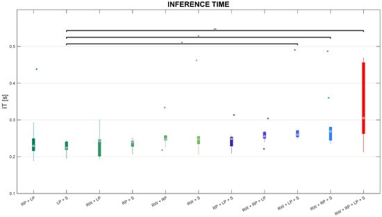 Friedman’s test leads to statistically significant differences in IT among sensor combinations. Besides, post-hoc tests revealed that IT in the RP+S combination is significantly lower than IT in both RW+LP+S and RW+RP+S triples with , as well as inferior than IT in the RW+RP+LP+S configuration with . Inference time stays below 300 ms in almost all sensor combinations, except for IT in the RW+RP+LP+S combination whose distribution reached the highest values (almost 450 ms), but less than 1 s.