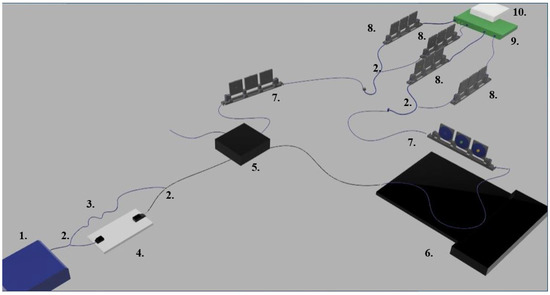 The 3D depiction of the setup employed for temperature-controlled quantum erasing. 1. Twin-photon source; 2. fibre-coupled polarising beam splitter/combiner (PBS); 3. compensatory delay fibre; 4. motorised translation stage with collimated optics; 5. non-polarising fibre-coupled beam splitter (BS); 6. polarisation-maintaining fibre mounted on thermally controlled optical bench; 7. polarisation-rotation paddles for polarisation-information erasure; 8. polarisation-rotation paddles for detector efficiency maximisation; 9. superconductive nanowire single-photon detectors (SNSPDs); and 10. time-tagging electronics.