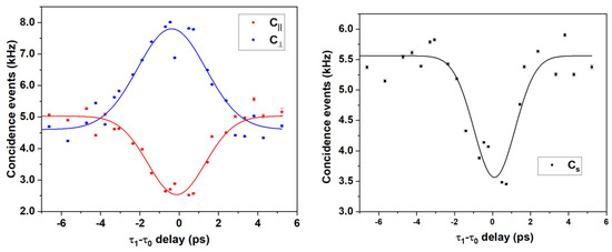 The HOM feature has been reconstructed by acquiring 100 measurements at a 1 s integration time for each single step of the translation stage, spanning a total of 13 ps in 23 steps. The results are plotted in Figure 3, where each dot represents an average over all the 100 acquisitions per step and is reported with its error (), with being the standard deviation.