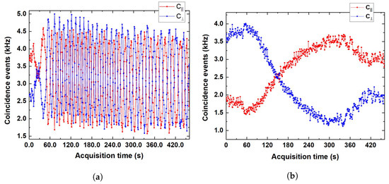 In agreement with (1), we can see the typical fringe pattern of the coincident events rates, with shifted by half a period with respect to by varying of the phase delay along the birefringent material placed after the beam splitter. Distance variations between two consecutive fringes are explained by the fact that temperatures in the thermal bench did not change linearly with time. Finally, the fringe amplitude results are almost constant during the acquisition period: according to (1), this confirms our assumption about not varying with , at least in the range of considered in the experiment.