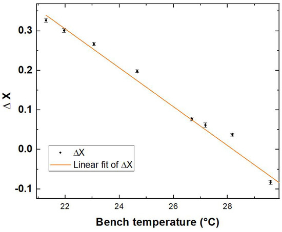 The application of a tunable and stabilised temperature across the thermally controlled optical bench (point 6. of Figure 1) and consequently across the polarisation-maintaining fibre (having a temperature dependent birefringence) welded to the bench translates into two polarisation-dependent delays, here reported as and since they refer to a variation in group or phase velocity of the two orthogonally polarised wavepackets, respectively.