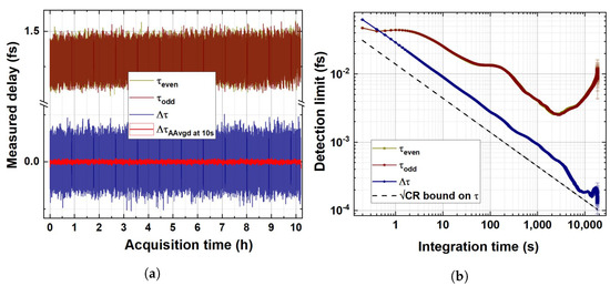 To assess the capabilities of the proposed sensor in terms of temperature-induced delay detection and in order to compare its performance to similar techniques already successfully presented in the recent literature about quantum optics and single-photon optical metrology, we performed a >10 h straight measurement overnight with a 100 ms integration time. The thermal bench temperature was actively stabilised at . For each measured set of coincidence channels, the variable has been calculated and successively converted in delays, , using the conversion given by the maximum-likelihood estimator , as reported in the previous section. It is a common practice in quantum metrology and sensing [23,30] to perform the long-term stability measurement of the parameter of interest (in this case, the delay, ) by sequentially hopping between two settings (and consequently in two different parameter values), hence evaluating the differential quantity , which allows us to efficiently prove the detection limit of the sensor (evaluated as the differential measurement which restores a unitary signal-to-noise ratio) while at the same time removing the common mode mechanical-, thermal-, and source-instability-related drift affecting the parameter measurement in the non-differential configuration.