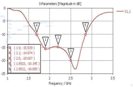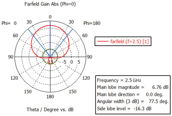 From the Figure 3, it can be observed that the return loss (S11) of the antenna remained below −10 dB (equivalent to VSWR < 2) across the frequency range of 1.7 GHz to 2.85 GHz. As indicated in Figure 4 below, the designed antenna exhibited characteristics such as gain and 3 dB beamwidth.