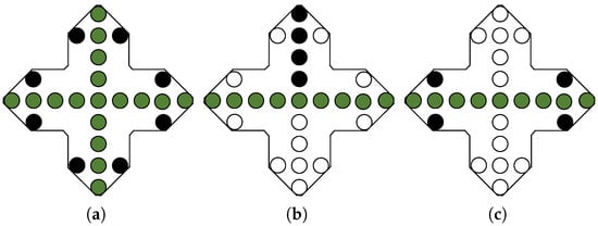 To establish a mathematical relationship model between aperture parameters and image parameters, optimization procedures involving aperture shape, size, element spacing, number of elements, and aperture formation time were carried out. This optimization design endeavored to attain high-quality imaging, while maintaining reasonable control over system complexity to meet the practical application requirements. To validate the effectiveness of the antenna array topology, a virtual aperture sparse array was formed by extracting certain transmit-receive antenna units based on the virtual dense aperture array. During the evaluation of the different extraction schemes for obtaining multi-baseline or single-baseline three-dimensional imaging performance, consideration was also given to the system weight. Figure 5 illustrates an approach for obtaining validation data based on a virtual dense aperture array, where the black circles, green circles, and white circles represent the transmit element, receive element, and idle element, respectively.