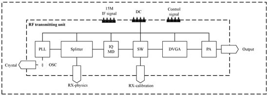 The frequency synthesizer and transmitter are pivotal components of this system. The frequency synthesizer’s primary role is to generate the SFCW local oscillator signal, while the transmitter is responsible for tasks such as quadrature upconversion, filtering, and amplification. To optimize the overall size and power consumption, this paper integrated the design of the frequency synthesizer and transmitter. The frequency synthesizer and transmitter comprise a crystal oscillator (serving as a common source for splitting), filters, a quadrature modulator, 1 × 2 RF switch (for toggling between calibration and transmission channels), digital attenuator, power amplifier, and more, as depicted in Figure 7.