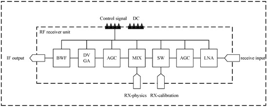 The receiver is mainly composed of a low-noise amplifier, RF AGC, switch, mixer, IF AGC, digital gain amplifier, and bandpass filter, as shown in Figure 8 below.