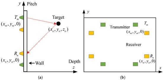 (a) is the left view and (b) is the main view. The entire imaging radar system contains M transmitting antennas and N receiving antennas. The mth transmitting antenna and the nth receiving antenna are located at , , where , . The form of the SFCW signal transmitted by the radar can be expressed as