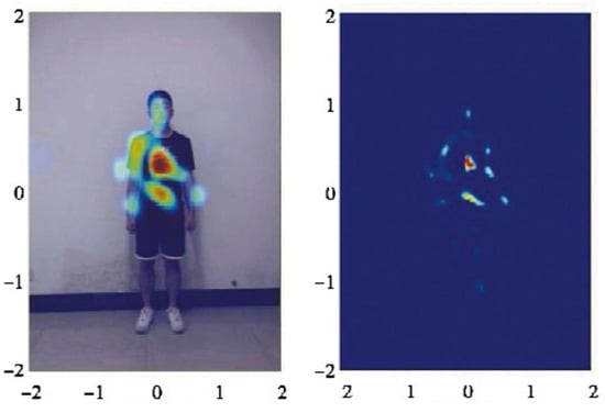This study drew inspiration from the approach presented in the relevant literature [,] to construct a radar system. The system generates SFCW signals and is equipped with a two-dimensional antenna array. The input data of the system are presented in the form of a two-dimensional heatmap, comprising horizontal and vertical heatmaps. The horizontal heatmap represents the projection of signals on a plane parallel to the ground, while the vertical heatmap represents the projection of signals on a plane perpendicular to the ground, with red indicating higher values and blue indicating lower values, as illustrated in Figure 1. Since radar signals are in complex in form, each pixel in the heatmap contains both real and imaginary parts. Thirty pairs of such heatmaps can be generated per second, providing a rich data foundation for subsequent pose estimation.