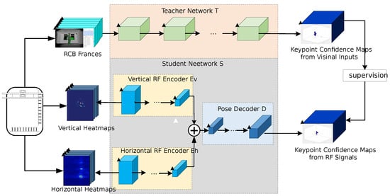 Traditional through-wall radar methods for target pose recognition primarily rely on directly extracting target pose information from radar echo signals. However, this approach is plagued by issues such as information loss, difficulty in capturing pose diversity, complex feature engineering, and inadequacy in adapting to complex scenarios. In the field of computer vision, the estimation of human body pose is commonly categorized into two approaches: top-down and bottom-up. The top-down approach involves initially detecting each person in the image and then applying a single-person pose estimator to extract keypoint information, as evidenced by prior works [,,,]. In contrast, the bottom-up approach, as demonstrated in previous studies [,,], first detects all keypoints in the image and then associates keypoints of the same target through a post-processing procedure. Radar echo images often struggle with clear target identification but can provide limited information about the positions of target keypoints. Furthermore, compared to traditional RGB-D sensors and external sensors like Vicon [,], radar signals have the advantage of being less susceptible to interference from walls and other opaque structures.