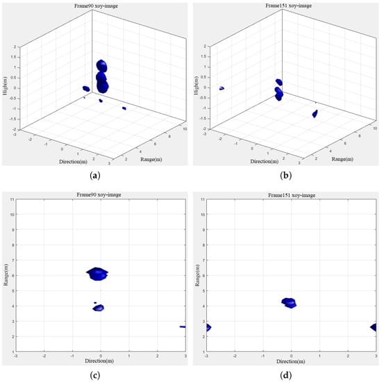 Each set of data was as follows: 1000 frames of data were collected for each of the standing pose (a), sitting pose (b), lying pose (c), and background, and a total of 4386 frames were collected. At the same time, supervised data modeling was performed, and a vector of size 4386 ∗ 1 was constructed as the supervised labels, with the standing pose labeled 0, the sitting pose 1, the lying pose 2, and the blank background 3. A total of 300 G of data points were subsequently collected according to this type of scenarios, respectively, for the single-person target, the two-person target, the single-person-plus-interference target, and the action target, and the data have been made available open-source.
