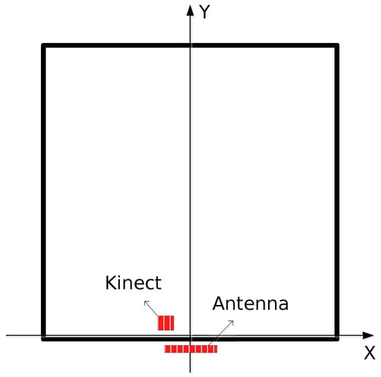 The real test experiment used a 10-transmitter and 10-receiver through-the-wall radar front-end unit, arranged in an ordinary empty room in 6 m ∗ 6 m. The through-wall radar was placed on the outside of the room close to the wall, the specific arrangement is shown in Figure 22 below. There was no obstructions between the target and the wall. It was sufficient for the target to make the prescribed required movements at a distance of 2 m from the wall.