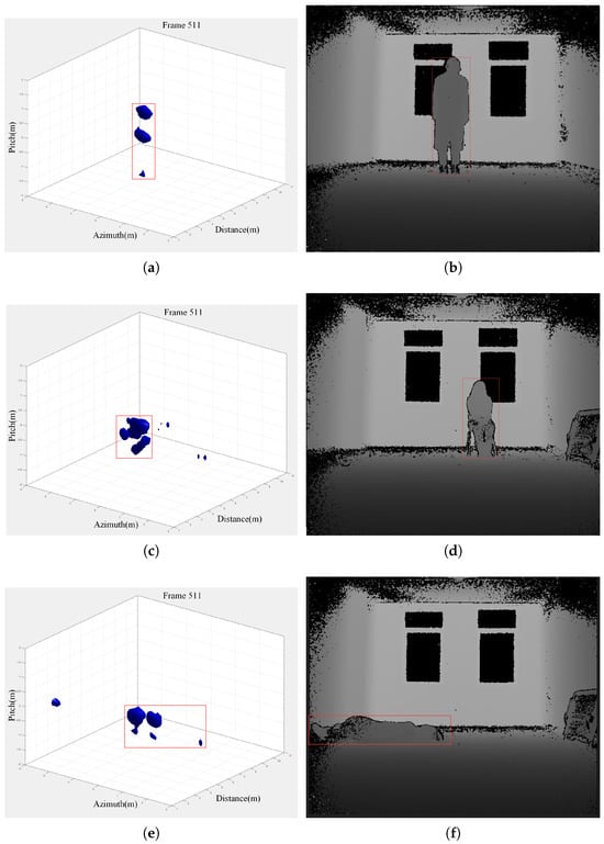 We collected a large amount of static data for three behaviors: standing, sitting, and lying. The data were precisely annotated to the second by personnel for subsequent pose detection. Three sets of typical radar 3D images were selected for comparison. Depth images captured using a Kinect device indoors were used for visual comparison. The images for identification are shown in Figure 23.