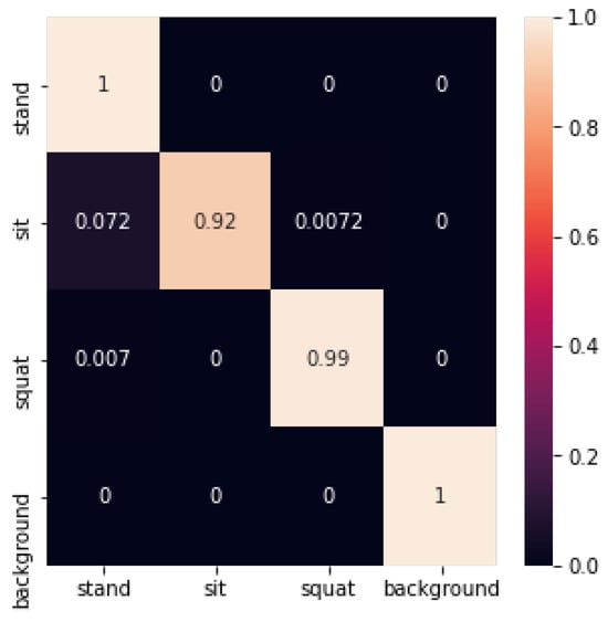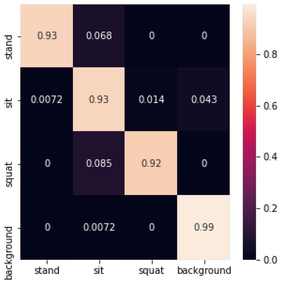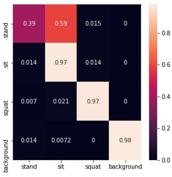 The convolutional neural network achieved an accuracy of 0.93 on the test set. It is worth noting that the convolutional neural network achieved better results for the recognition of the sitting posture, squatting posture, and empty background. However, it often recognized the standing posture as the sitting posture.