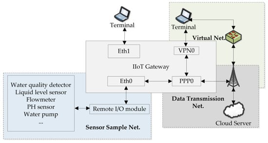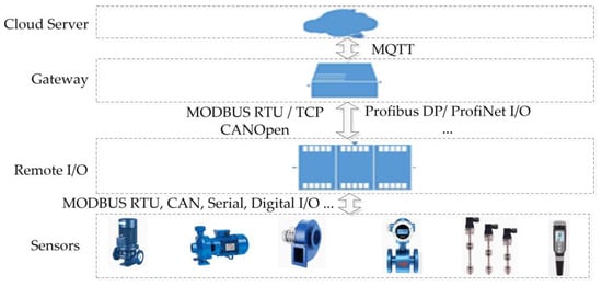 As Figure 4 shows, sensors are used to sample the information of the devices and instruments such as thermometers, flow meters, water level meters, pH concentration meters, frequency converters, and so on. The remote I/O unit collects sensor data and provides the sensor data to gateways [35] based on the different industrial control protocols [36,37,38]. The IIoT gateway is responsible for sending sensor data to the cloud server via the MQTT format. The cloud server is used to analyze and display the sensor data.