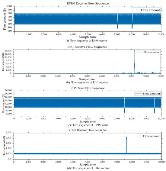 In Equation (14), S1, S2, S3, S4, S5, S6, S7, and S8 represent the coding subsequence of the received or sent flow sequence. In Equation (15), is the encoded value of one point, l is the length of the sliding window, and Con is a connection function. Figure 3 shows the network flow sequences integrated diagram for Eth0, Eth1, PPP0, and VPN0 at the receiving and sending dimension.