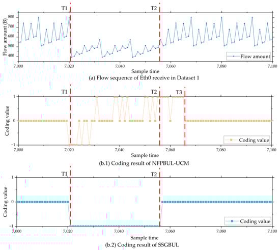 Figure 10a shows part of the Eth0 flow data in IIoT Dataset 1. During T1 and T2, one remote I/O unit disconnected, so the Eth0 receive flow decreased relatively. Figure 10(b.1) shows the coding result of the NFPBUL–UCM model. It can be observed that, during T1 and T2, the abnormal network flow is encoded as −1, 0, or 1. During T2 and T3, the normal network flow is encoded as 1 or 0. Figure 10(b.2) shows the encoding result of the SSGBUL model. We can see that all abnormal network flows during T1 and T2 are encoded as low threshold outliers −1, and the regular data are correctly encoded as 0.