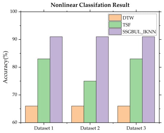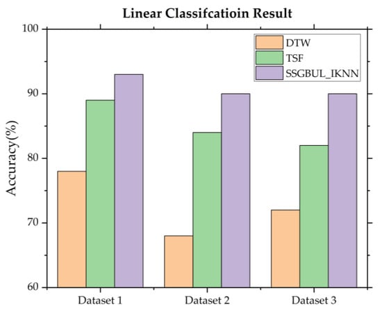From Figure 11, we can see that the linear fault detection accuracy of SSGBUL–IKNN is significantly higher than the accuracy of DTW and TSF.