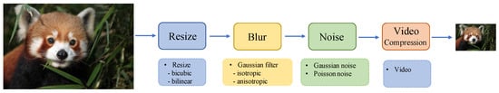When the classical degradation model is employed to synthesize training pairs [28], it becomes challenging to acquire high-quality real-world LR–HR image pairs. The network model exhibits limitations in learning from image pairs that faithfully represent real-world scenarios, leading to suboptimal performance in the restoration of corrupted video sequences under real-world conditions. The classical degradation model incorporates typical fundamental degradations, such as blur, resize, and compression, and can be considered as first-order modeling. However, degradation processes in real-world scenarios are highly diverse, comprising a multitude of steps such as camera imaging systems, internet transmission, etc. Inspired by Wang et al. [16], it becomes evident that a complex degradation process cannot be effectively modeled with a first-order approach. A higher-order modeling process is proposed to simulate the intricate degradation processes found in the real world, denoted by S. The degradation space S is composed of a series of degradation process . Specifically, our method incorporates a range of degradation operations, including noise (both Poisson noise and Gaussian noise) [29], various forms of blurring (isotropic, anisotropic, Gaussian filter), resizing (both bicubic and bilinear), and JPEG and video compression. As in Equation (1), let y stand for the original high-resolution (HR) frame, where D represents a set of various degradation operations and X corresponds to the derived low-resolution (LR) frame after undergoing degradation. Depending on the specific application scenarios, customization of the degradation process is feasible, such as the inclusion of additional noise or adjustments in degradation factor parameters.