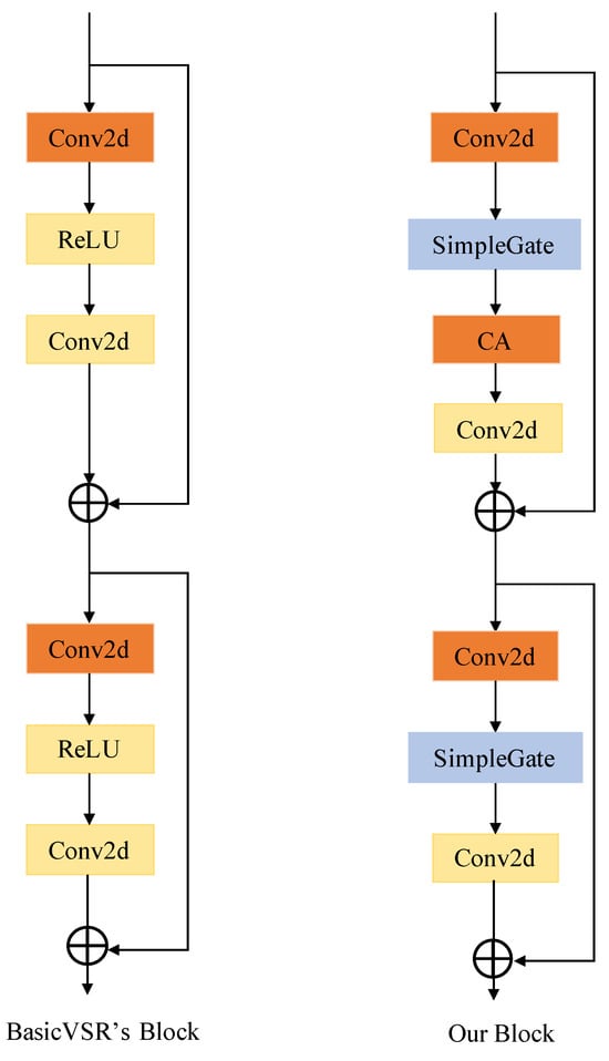 BasicVSR’s block contains the most common elements. Our reconstruction module replaces ReLU with SimpleGate, eliminating the presence of a non-linear activation function, and introduces a channel attention mechanism.