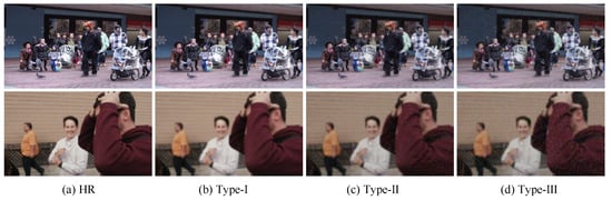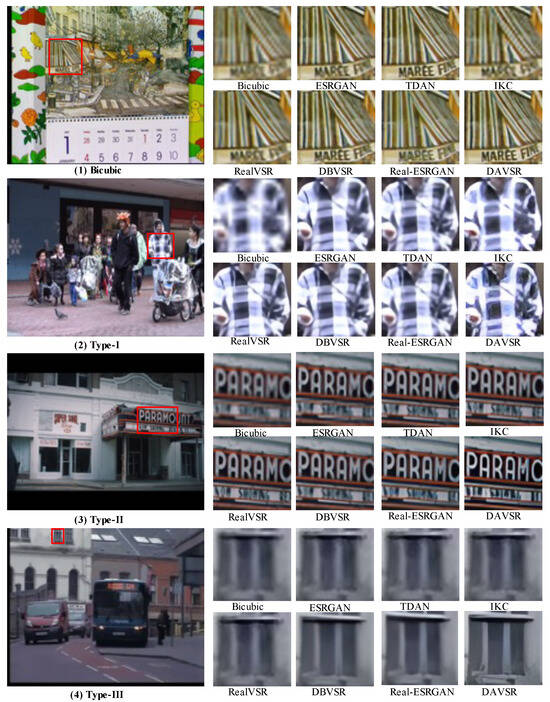 Existing non-blind VSR methods are assessed on specific synthetic datasets, which cannot reflect the performance of the real-world video resolution enhancement. The testing datasets evaluated by some blind super-resolution methods are only specifically designed synthetic data. For instance, IKC is assessed by synthetic LR images that are blurred and downsampled. As far as we know, a comprehensive low-resolution video dataset, encompassing noise degradations and diverse blurs, is currently unavailable. For quantitative evaluation, we synthesized LR–HR pairs by subjecting the validation datasets to three levels of degradation in vid4 [35] and vimeo-90k [36]. An illustration depicting video frames with different types of degradations is shown in Figure 5. Specifically, the three degradation types for vid4 and vimeo-90k include (1) Type I: a first-order degradation model equipped with blur, noise with Gaussian [1, 10], and video compression. It corresponds to slightly corrupted frames. (2) Type II: a first-order degradation model equipped with blur, noise with Gaussian [1, 20], resize, and video compression. It corresponds to moderately corrupted frames. (3) Type III: a two-order degradation model, a repeated first-order degradation model, which corresponds to real-world badly corrupted frames. Although the proposed three-level degradation model is not flawless, it strives to cover the entire degradation space of the real world. We contend that the performance of testing datasets can reflect the advantages of our method.