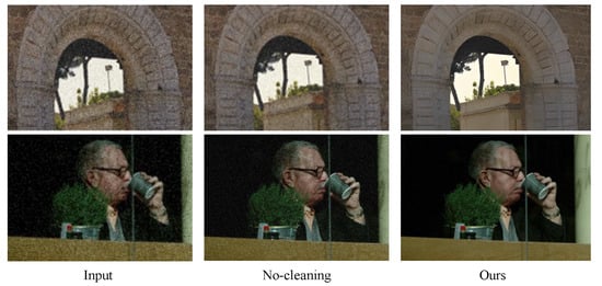 We conducted experiments to validate the effectiveness of our pre-processing strategy. Initially, the network was trained with the inclusion of the pre-cleaning model. The degraded video frame sequences underwent optical flow alignment and reconstruction directly without passing through the pre-cleaning module, resulting in temporal redundancy being introduced by the degradation process. Examples are depicted in Figure 7. The network without a cleaning strategy lacks sufficient suppression of artifacts and noise, resulting in perceptually impactful noise in the recovered images. This is attributed to the network without a cleaning strategy, which fails to eliminate redundant temporal information, consequently amplifying noise and artifacts. Consequently, it yields a comparatively diminished efficacy in restoration compared to the cleaning network.