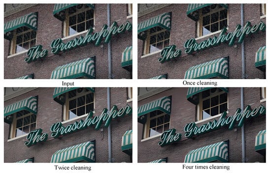 Furthermore, we kept the cleaning module and explored the influence of the number of cleaning iterations on the removal of temporal information. The restoration results for images with degradation type I are shown in Figure 8. On the one hand, when the cleaning module is applied only once, the noise is not removed and blurriness persists. On the other hand, employing the cleaning module four times results in excessive noise removal, leading to an unrealistic over-smoothing of images. We observe that for mildly degraded images, applying the cleaning module twice is optimal. As anticipated, for images representing degradation type III, characterized by severe degradation, the application of the pre-cleaning module twice is insufficient. Our observations indicate that, in most scenarios, a maximum of three iterations suffices. We ascertain that for images exhibiting degradation types I and II, a two-fold application of the pre-processing module will suffice. Conversely, for images representing degradation type III, a three-fold application of the module is deemed adequate.