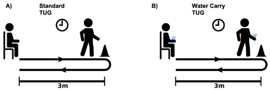 (A) Standard and (B) water-carry TUG assessments. Participants began seated, rose to a standing position, walked 3 m, performed a 180° turn, walked back 3 m, and then returned to a seated position. For the water-carry TUG assessment, participants performed the same task while carrying a tray with a cup filled with 325 mL of water.