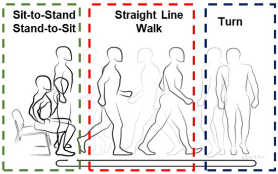 Data were captured (128 Hz) and processed using the Moveo Explorer data collection software (APDM Inc., Portland, OR, USA). The Moveo Explorer™ software (version 1.0) analyzed the raw data from all sensors using an integrated and automatic algorithm to calculate the durations and outcome measures of the TUG phases. The TUG can be divided into four phases: (1) sit-to-stand, (2) straight-line walk, (3) turn, and (4) stand-to-sit (Figure 2). The sit-to-stand time is the time required to stand up from a seated position at the beginning of the assessment. The straight-line walk time represents the time required to walk 3 m to a piece of the tape on the floor plus the time to return to the chair. Turn velocity indicates the peak angular velocity of the trunk during the turns. As two turns are involved in the TUG assessment, the average turn velocity was used in the analysis. Finally, the stand-to-sit duration is the time required to transition from standing to seated at the end of the trial. Algorithms to detect postural transition movements during the instrumented TUG have been shown to display good sensitivity and test–retest reliability [17,21].