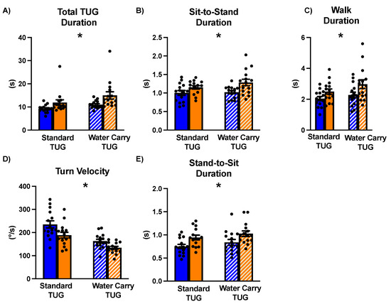 Mean and standard deviation data for TUG outcomes during phases of a standard and water-carry TUG can be observed in Table 2.