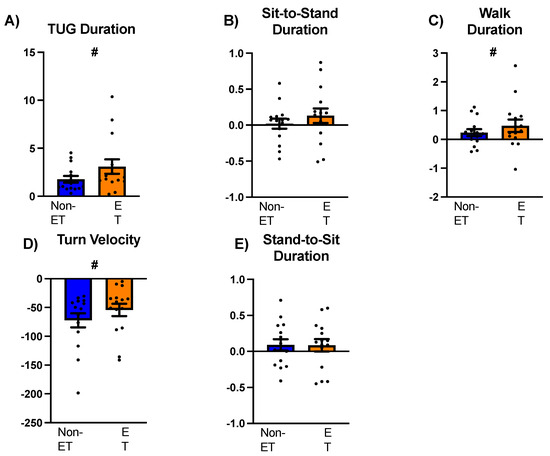 A comparison of performance between standard and water-carry TUGs in individuals with and without essential tremor. Positive values indicate longer/faster performance during the water-carry TUG, while negative values indicate shorter/slower performance during the standard TUG. Panel (A): total TUG task duration, Panel (B): sit-to-stand phase, Panel (C): straight-line walk phase, Panel (D): turn velocity in the turning phase, and Panel (E): stand-to-sit phase. Blue bars represent the non-ET group, while orange bars represent the ET group. Black-filled circles indicate individual data points. Standard error bars are also depicted. The symbol # denotes the main effect of the condition.