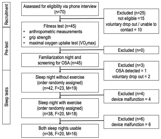 Healthy volunteers were recruited in the city of Calgary, Canada through poster and email notifications from the Cumming School of Medicine at the University of Calgary and Foothills Medical Centre. The eligibility of interested participants was assessed over the telephone with a screening questionnaire. The inclusion criteria included: age between 18 and 35 years, body mass index (BMI) ≤ 30 kg/m, residence in Calgary > 1 year, no prior diagnosis of obstructive sleep apnea (OSA), no current medications known to affect vasculature, and no history of cardiorespiratory disease, hypertension, or smoking. A total of 15 participants were not eligible due to these inclusion criteria. Participants and their physicians provided written informed consent. This study was approved by the University of Calgary Institutional Conjoint Health Research Ethics Board (Protocol # REB16-1027). Before the first fitness assessment, 10 participants withdrew from this study due to time constraints. After the familiarization study night, one participant was excluded due to obstructive sleep apnea (OSA), and their family doctor was notified. Figure 1 illustrates the flow of participants through every step of this study.