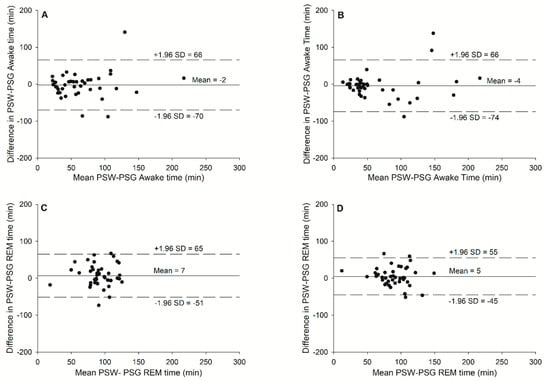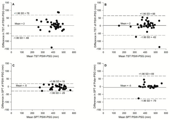 Bland-Altman plots for (A) total sleep time (TST) without exercise, (B) total sleep time (TST) with exercise, (C) sleep period time (SPT) without exercise, (D) sleep period time (SPT) with exercise against the mean of the two measurements with the prototype sport watch (PSW) and the gold standard, PSG.
