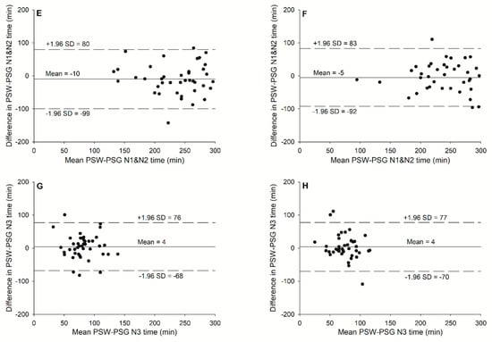 Bland-Altman plots for (A) awake time without exercise, (B) awake time with exercise, (C) REM stage time without exercise, (D) REM stage time with exercise, (E) N1 and N2 (light sleep stage) time without exercise, (F) N1 and N2 (light sleep stage) time with exercise, (G) N3 (deep sleep stage) time without exercise, and (H) N3 (deep sleep stage) time with exercise against the mean of the two measurements with the prototype sport watch (PSW) and the gold standard, PSG.