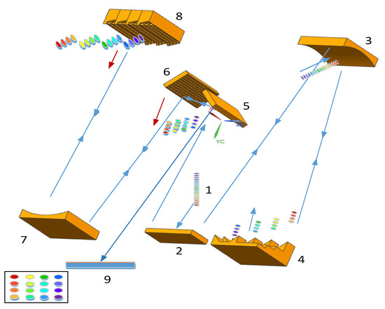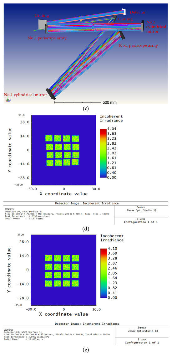 Considering the characteristics of the periscope array, off-axis point imaging will cause object—image flip, which results in the spatial position of the image in each frame, so that the image converging at the grating again does not satisfy the achromatic condition. The actual optical path from the grating and the cylindrical mirrors to the periscope array is shown in Figure 7.