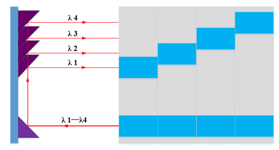 The schematic diagram of the one-dimensional spatial mapping module is shown in Figure 3. The cylindrical mirror is equivalent to the transmissive mirror, and separation points P1, P2, P3, and P4 on the periscope array correspond to the wavelengths λ1–λ4 dispersed by diffraction grating.