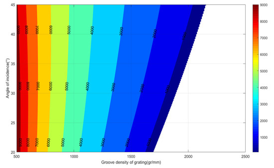 According to Equation (3), the grating constant d, the angle of incidence θi, and the relationship with the focal length of the cylindrical mirror f can be determined. Let w0 = 6 mm, m = 1, λ1 = 790 nm, λ2 = 791.25 nm, and set the groove density of grating in the range of 500–2500 g/mm, and angle of incidence in the range of 20°–45°. The relation curve is plotted as shown in Figure 4, where the horizontal coordinate is the density of the grating lines, the vertical coordinate is the grating angle of incidence, and the contour line indicates the focal length of the cylindrical mirror. As can be seen from Figure 4, the focal length along with an increased density of grating lines decreases under the same grating angle of incidence, while the focal length along with an increased grating angle of incidence increases under the same density of grating lines.