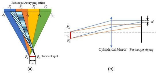 As shown in Figure 5a, in the plane formed by the direction of the grating line and the grating normal, the incident spot is projected as a line segment with projection size w, and the two endpoints are Pa and Pb. The parameters of the grating and the cylindrical mirrors above are designed based on the point of Pa, and the P1, P2, P3, and P4 points on the periscope array correspond to the wavelengths of λ1, λ2, λ3, and λ4, which are based on the dispersion of Pa. The wavelengths λ1–λ4 no longer correspond to P1–P4 points on the periscope array for the other endpoint Pb.