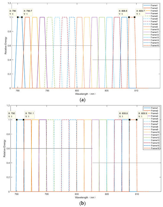 The equivalent optical structure is shown in Figure 5b, where w′ represents offset at any wavelength. We set the offset w′ equal to w, and then the energy distribution of each frame is shown in Figure 6a, where the groove density of the grating is 1800 g/mm, the angle of incidence is 30°, and the focal length of the cylindrical mirror is 1067.5 mm. The analysis above ignores the diffraction efficiency of the grating and the reflectivity of each mirror surface. The horizontal coordinates represent wavelength, the vertical coordinates represent normalized energy, and the curves of different colors represent the normalized energy of each wavelength in a different frame. The flat top indicates the wavelength range without crosstalk; in Figure 6a, its ratio to the design bandwidth (1.25 nm) is between 56% and 72%. We believe the ideal situation is when the ratios are all greater than 85%. While the offset w′ is equal to w/6, the energy distribution of each frame is shown in Figure 6b, and the ratio is between 88% and 96%, which can better eliminate the effect of inter-crosstalk.