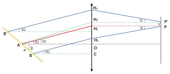 The distance between the B′ point position and point A can be determined using Equation (11), when the focal length f 2 » L1x, the outgoing and incident light rays satisfy the grating equation at the same time, and there is no chromatic aberration in our module. We can obtain: